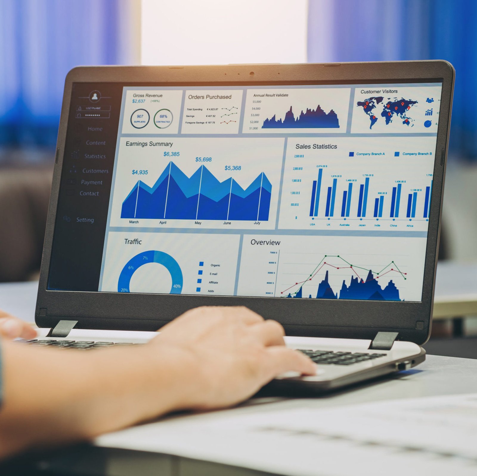 Business woman working on financial big data analysis on computer laptop - Focus on left hand